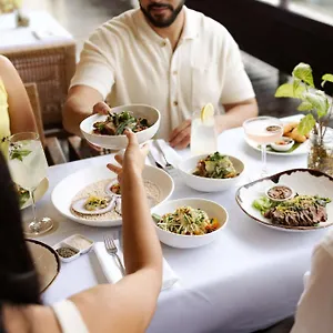 El Shangri-La The Marina, sirve un desayuno buffet por la mañana. Entre otras instalaciones de este hotel se encuentra el restaurante Backyard, que sirve cocina australiana, así como el restaurante Backyard Deck, que ofrece comida australiana. Dispone de un bar en la piscina.